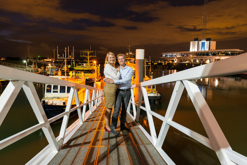 Rotterdam is een fotogenieke stad en er worden daarom veel trouwreportages en andere soorten fotoseries gemaakt. Maar ik had een idee in mijn hoofd dat anders was. Omdat de haven zo belangrijk was wilde ik in de avond foto’s van hun gaan maken in het havengebied. Om dit mogelijk te maken moest ik wel met externe flitsers gaan werken, iets dat ik tijdens een trouwreportage eigenlijk maar zelden doe. Daarom hulp van mijn goede vriend Henk ingeroepen en besloten om de preweddingshoot in twee gedeeltes te doen: een ‘normale’ in de omgeving van de Erasmusbrug (hoe kan het ook anders) en een ‘experimentele’ in de avonduren waarbij we de haven in zouden gaan.