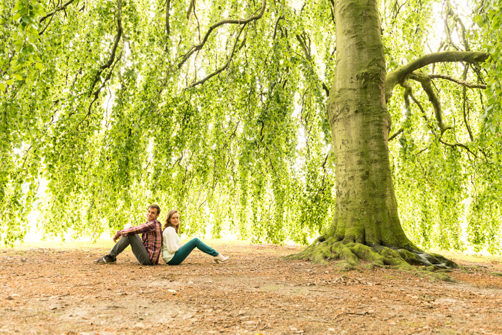 Het van Boetzelaerpark in De Bilt is een plek niet ver van waar Marieke woont en dus liepen we al snel door het park. Met net een enorme regenbui die voorbij getrokken was waren we allang blij dat het even droog was maar we werden getrakteerd op een prachtige zon en een lekker temperatuurtje. Al slenterend door dit kleine maar afwisselende park kwamen we een mooi bruggetje, speeltuigen en water tegen maar vooral ook prachtige oude bomen. En daar hebben we gebruik van gemaakt tijdens deze preweddingshoot! Marieke en Arwin hadden nog nooit eerder een fotoreportage gedaan maar ze waren zeer ontspannen voor de camera. Na het rondje afgemaakt te hebben stapten we de auto weer in waarna de volgende bui losbarstte. Hopelijk geen voorteken voor hun bruiloft!