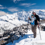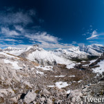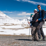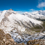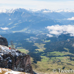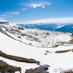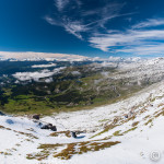 Het bleek boven vrijwel windstil te zijn en met de zon die krachtig scheen was het heerlijk om hierboven te zijn. En eenmaal rustig om ons heen kijkende bleek het uitzicht fenomenaal te zijn. De vorige keer was het al uitzicht al indrukwekkend maar nu met de besneeuwde bergtoppen, de intens blauwe lucht erboven en de nog groene dalen was het echt bijzonder mooi! Wat rondlopend bleek al snel dat de wandeling die we wilden maken niet ging lukken, daarvoor was de sneeuw te hoog maar in plaats daarvan liepen we op de hoogvlakte wat rond en genoten we van het uitzicht. En werden er natuurlijk heel veel foto’s van al dit moois gemaakt.